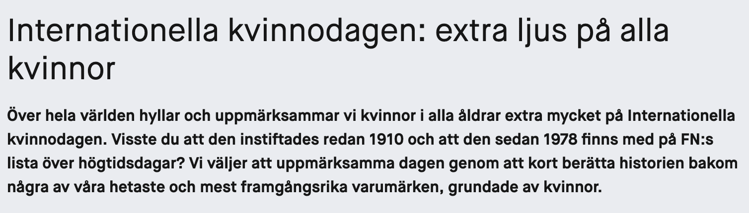 Hej alla! Jag trodde tiden var förbi då 8 mars var dagen då man gratulerar människor till att ha fötts med en livmoder? Men det är det absolut inte. SVT har till och med gått in och parerat eftersom de här konstiga gratulationerna är så vanliga: För förvirringen är total. Vad handlar den där dagen om, om man inte ska hylla KVINNAN, frågar sig ICA i Båstad som gjort en rös av en kotlett så att kvinns både kan fira med att äta en festmåltid OCH dessutom känna sig romantiskt uppvaktade pga ros. Här har vi rosen och ja, det är en "satsning" på Internationella kvinnodagen (limited editon). KICKS PR-avdelning tänker att det är väl en dag då man kan passa på att kränga lite dubiös, normativ, female performing produkter? Jag menar, om vi vinklar det på att det är kvinnor som skapat märket och därmed tjänas cashen? Girlpower! ...att Elizabeth Arden, som de hyllar som kvinnlig entreprenör, idag ägs av Revlon som visserligen har en kvinnlig CEO sedan fem minuter tillbaka men är det verkligen bästa exemplet på kvinnig autonomi? Sak samma. Grattis alla QUINNOR! Nu sminkar vi oss! |